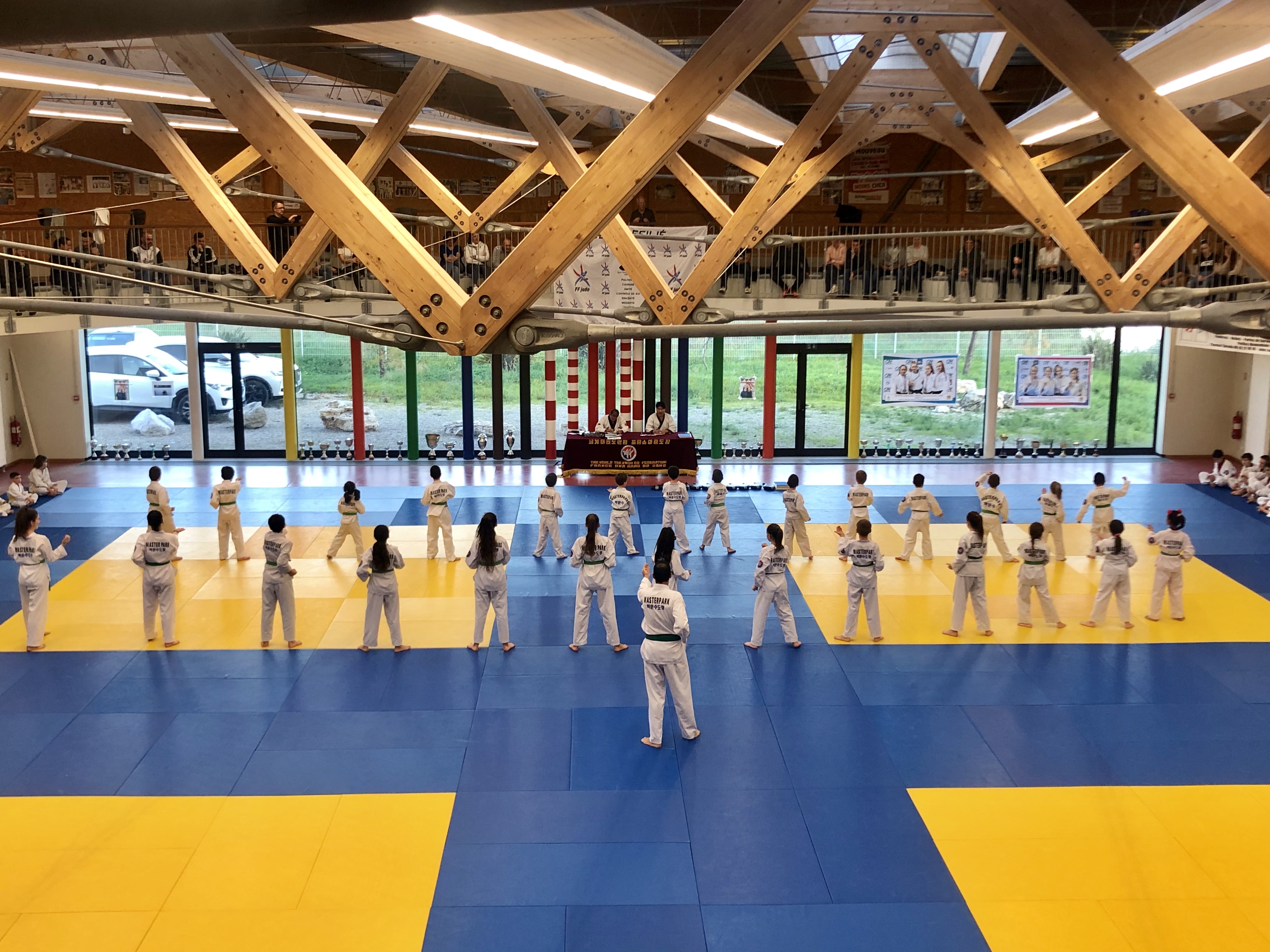 Les enchaînements gestuels de techniques de combat s’opèrent. Les deux maîtresfont face aux élèves. Ils notent les prestations. Le dojo municipal des Pugets est un lieu adéquat pour ce rendez-vous trimestriel. Les parents peuvent assister à la représentation en prenant place dans les gradins. La forme circulaire du dojo permet à ces derniers d'apprécier ce rendez-vous traditionnel. Aziz El Kellali continue de se battre pour sauvegarder cette discipline telle quelle : « Depuis plus de 20 ans, nous recevons Park Moon Son, qui vient directement de Corée ». De la ceinture jaune à la rouge, le grand-maître estime si le passage d’un Dan à un autre est possible. L’humour de Park Moon Son apporte une certaine légèreté à cet événement important pour les licenciés. Les coups s’élèvent plus facilement. Même si les sportifs sont stressés par sa venue, ils parviennent à se surpasser. Afin de montrer leurs concentrations et leurs forces, les élèves frappent des Kyeupa (planche en bois). Après avoir poussé un cri de détermination, le poing sectionne la planche en deux. La journée était attendue depuis plusieurs jours, elle avait dû être reportée en raison des intempéries. Mais ce jour-là, la rencontre a été possible. Et chacun a pu s'élever, en grade comme en spiritualité.