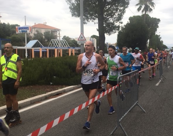 C’est parti. Premières foulées aux portes de Cap 3000, on file entre les échoppes de la zone commerciale. Mais, c’est pas le moment de faire les boutiques. Devant, ça envoie du lourd. Vu le rythme, on est sûrs que les fonceurs nous mettront un tour dans la vue ! Nous voilà sur la route du bord de mer, chaussée sud. Libérée des voitures, pour nous. Quel luxe ! On l’emprunte à contresens et, faut bien le dire, on n'a pas de risque de se faire flasher...