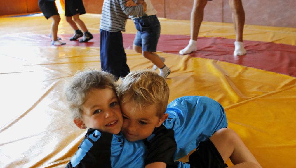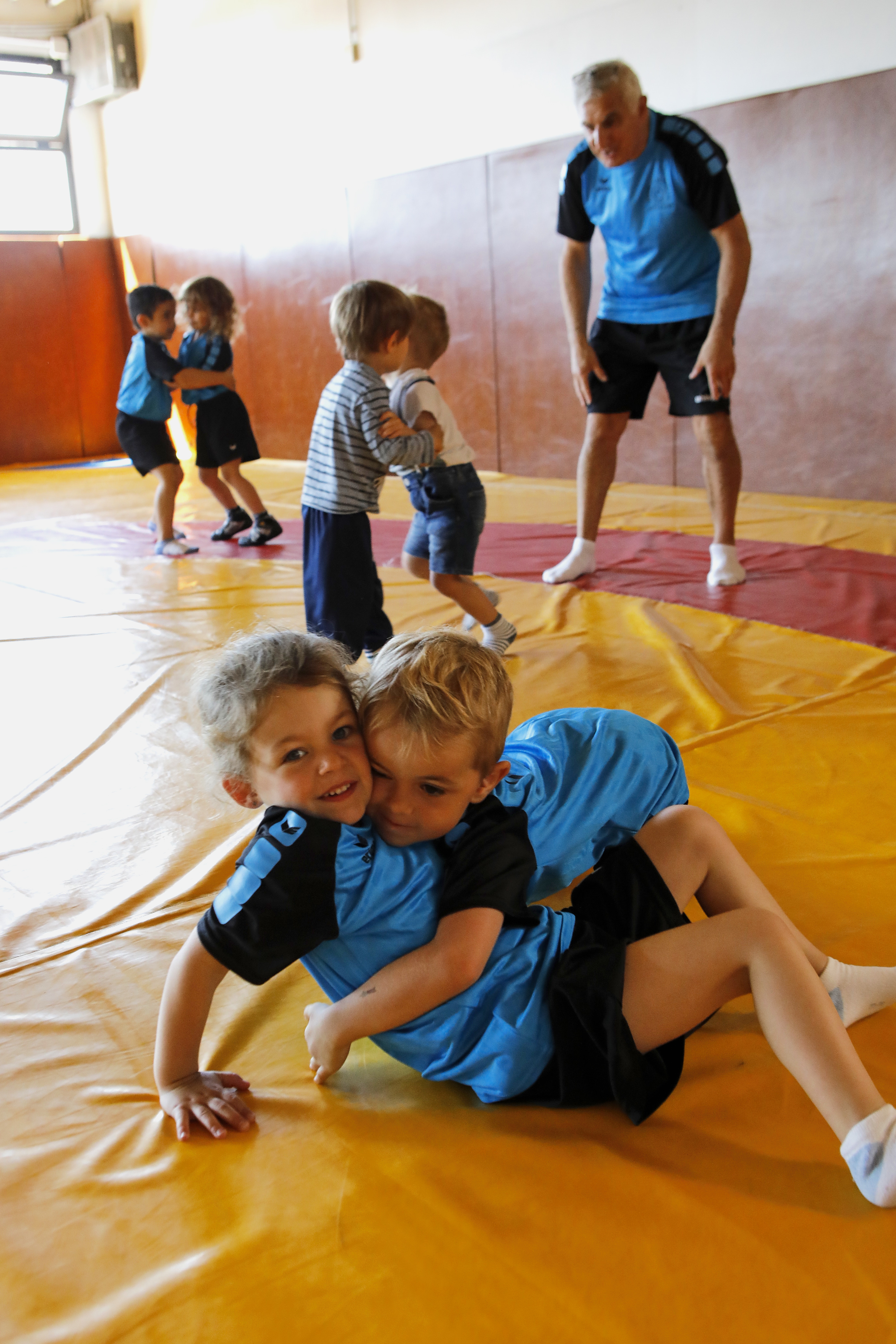 Une joyeuse effervescence emplit la salle Maurice Sauvageot . Nulle trace de judoka mais des enfants (6 à 11 ans) qui affectionnent le justaucorps des lutteurs plutôt que le kimono. « Pas de cris, on respecte les consignes et on ne tire pas les vêtements », ordonne d’une voix posée l’entraîneur. En cet après-midi, la séance s’avère ludique.