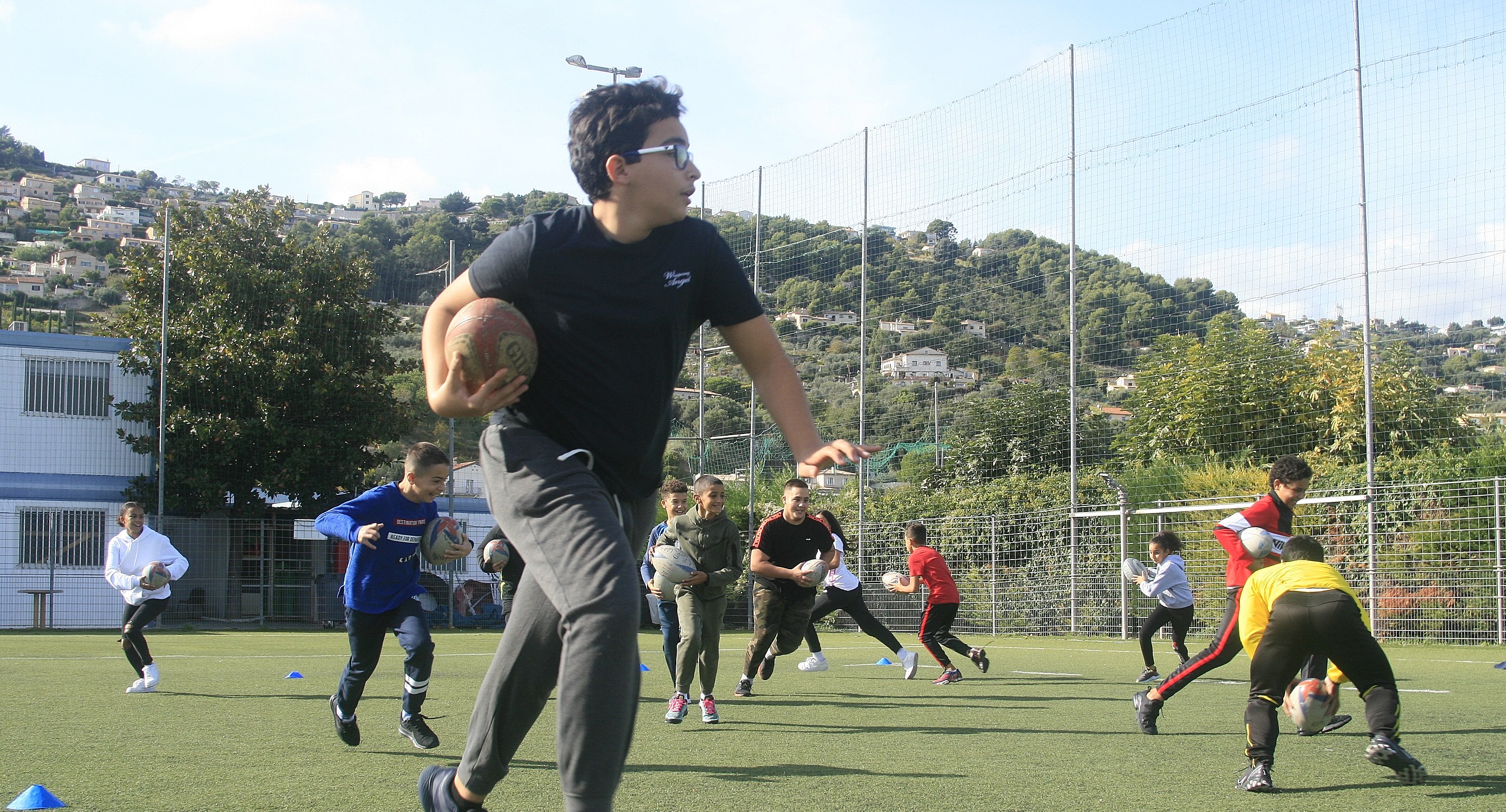 En tout, c'est une quinzaine de garçons et de filles de 11 à 16 ans encadrés par Sonia Labbaoui accompagnée pour l’occasion par Tony et Ayoub (deux animateurs présents pour les vacances scolaires) qui ont profité du savoir-faire et de la patience du responsable technique de l’école de Rugby à l’occasion d’un après-midi* sportif et récréatif spécialement préparé pour eux.